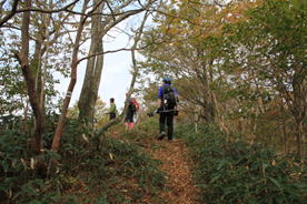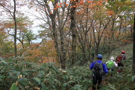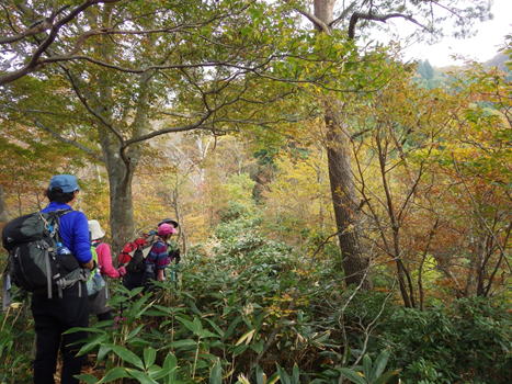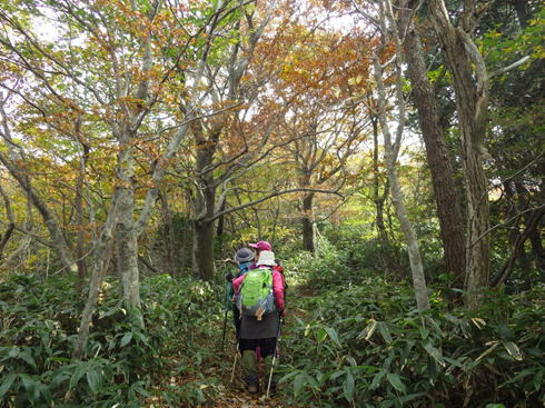 秋の登山道 11時54分 クマザサと紅葉の中、快調に下る
