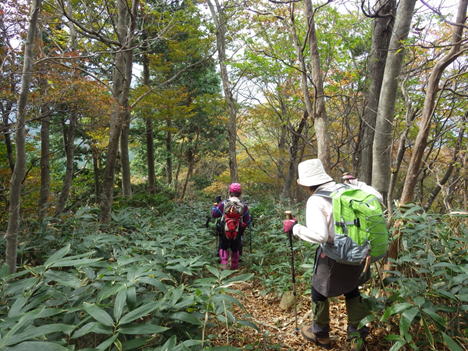 紅葉する高岳山の稜線歩き 背丈近くまで伸びたクマザサが茂る登山道