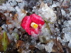 落花したヤブツバキが雪とコラボしてとても美しい!