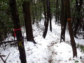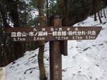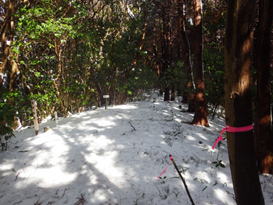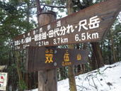 4、建郷山分岐に戻った 12時31分 建郷山の山頂から本道(田床峠)に下る別ルートがあるので、いくつか赤テープに沿って下ってみたが、山は雪に覆われ道がわからない。途中から、続いているはずの赤テープを見つけることが出来ずに引き返した。ちょっと残念だったが、アイゼン(簡易)をしていてもズルズルと滑る急な斜面に苦労していたので、ルートを探るのを早目に断念した。 |