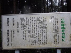 この森林(もり)を大切に 森林は、山に降った雨を枝や根でとらえ、急激に流れ出て洪水になるのを防いだり、日照りの時には根でとらえていた水を供給する「緑のダム」となり、私たちに恩恵を与えてくれる大切な資源です。この大切な森林を作るために、スギ、ヒノキの植林、夏の炎天下での枝打ち作業など大変な苦労があり、やっとここまでになりました。(看板より抜粋) |