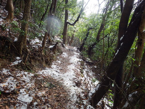 朝起きてみると雨。山行きも、その気になれず悶々としていたが、10時を過ぎる頃から日が射してきた。自宅から皿倉山を見てみると、山肌を雲が駆け上っているではないか。雲間から見える山肌はうっすらと雪化粧している。「これは行くしかない」と、少々出遅れたが急ぎ山へと向かった。「さてどこに登ろう?」 既に満車状態の鷹見神社駐車場を横目に市ノ瀬峠へと向かった。 |