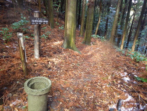 田床峠の道標 12時37分 この角度から見るとわかり難いが、この道標の裏に建郷山への分岐表示が付いている。先程断念したコースはここに続いているはずだ! 次回に挑戦 |