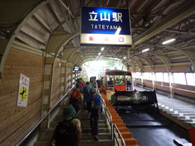 13、美女平から立山ケーブルカー 10時52分 45分程バスに揺られて美女平に到着した。慌ただしくケーブルカーに乗り継いだ。 下界に下るにつれお天気が良くなってきた。 高度が下がると気温もかなり上昇して、半袖でも汗が出てくる。 今までは高所の天然クーラーの中にいた訳だが、ケーブルを降りるといつもの真夏の状態だった。 |