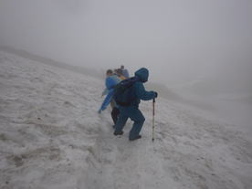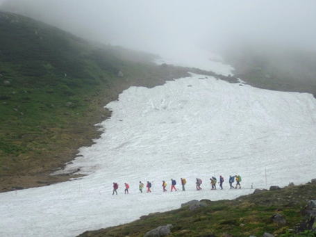 雪渓との格闘 14時38分 雨が降ったので雪渓がとてもよく滑る。皆さん重心を下げて慎重に歩いている。 そろりそろり |