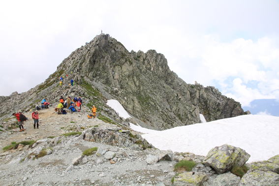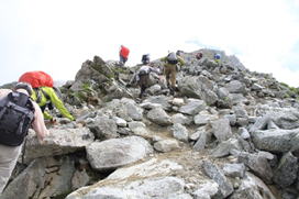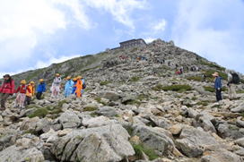 山頂はもうすぐ 10時39分 相変わらず渋滞は続いている。あと少しで頂上とういう場所で、渋滞を我慢できずに列を離れて上る人も出てきた。しかし、登山道を離れて他の登山者を追い抜く際、焦って歩くのでつい足に力が入り、時々上から石を蹴って落としている。注意して見ていると、勢いのついた直径20センチ程の石が私の方に落ちてきた。 これは危なかった!焦る気持ちは分るが・・・。 |