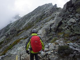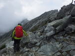 ガレ場の尾根を歩く 11時25分 雄山の頂上から大汝山への登山道に入ると登山者がグッと少なくなった。殆どの人が雄山から引き返すようだ。 慎重に歩く |