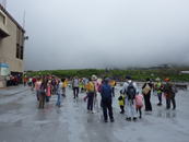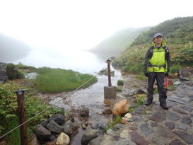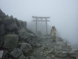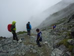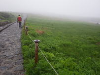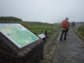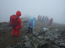 雷鳴は轟き視界は不良 13時23分 雨、霧、雲、そして雷まで・・・。さっきまでのお天気はいったいどこへ行ったのだろう? 雷鳴轟く中、必死に下った。雨で登山道はとても滑りやすくなっている。 団体登山者の渋滞に巻き込まれ、なかなか前に進まない。子供たちも悪条件の中、我慢して歩いている。とにかく滑って転ばないように注意して下山した。 |