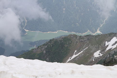 朝食後、ヒュッテのベランダから雷鳥沢キャンプ場方面を眺める 5時56分 雪渓が美しい