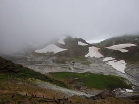 室堂山荘を通過 8時17分 室堂平は霧に包まれていた。 ![]() |