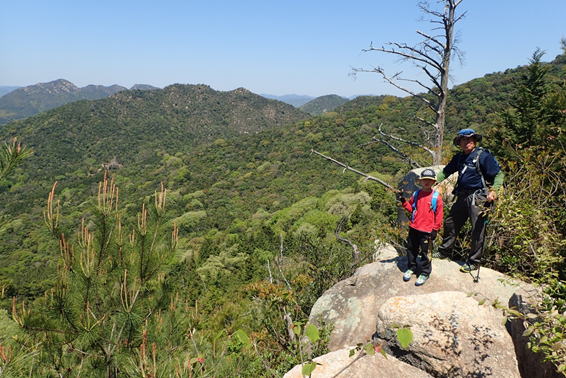 抜群の展望が広がる 11時26分 繁みを抜けると、そこは絶景ポイント!既にT井さんとお孫さんが先端の岩で景色を楽しんでいた。正面に見えるのはこれから縦走する勘十郎岳。その山頂部は大きな岩が露出していて、荒々しい姿が格好いい。まだまだ距離がありそうだ。その左奥には「火の山連邦」が顔を覗かせている。 |
