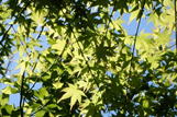 森に入ると急坂に 10時17分 木漏れ日の中、気分よく上って行く。 見上げると新緑が綺麗。 モミジの新緑 |