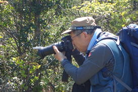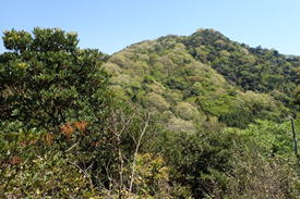 振り返ると大海山 12時55分 大海山を出発して17分。大海山の山頂がもうあんなに遠くになってしまった。 山肌は黄緑色の新緑に彩られ、山全体が「モコモコ」とメタボ状態。陽気に誘われ、ウグイスや他の野鳥たちも競って囀っている。 のんびり歩く尾根歩きは、登山と言うよりハイキング気分で歩いていた。 |