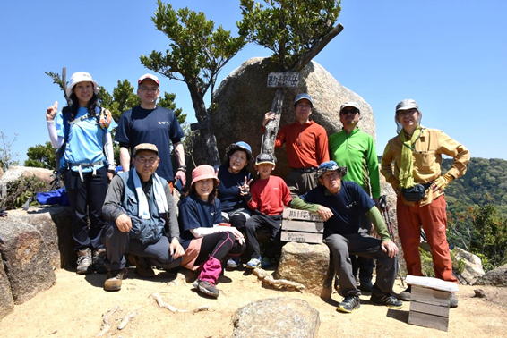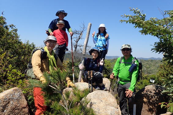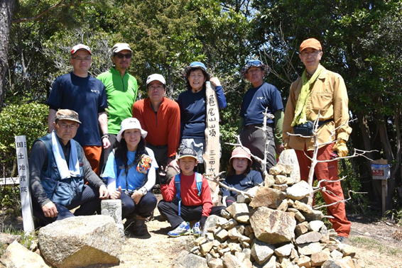 | 8、勘十郎岳・西峰(主峰) 13時44分 246m 全員笑顔で記念撮影(写真提供:Y川さん) |