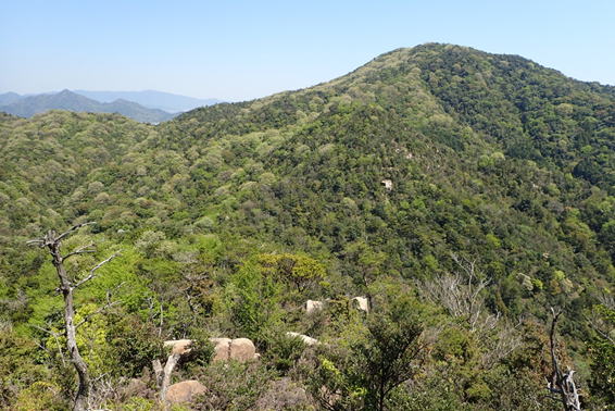 | 今歩いてきた中岳と大海山を振り返る 13時19分 新緑の山肌 |